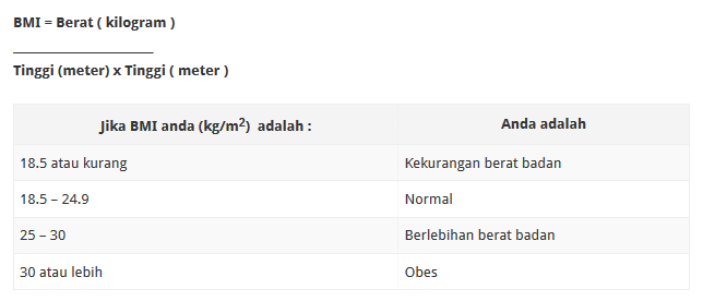 Anda mengalami kurang berat badan jika BMI anda kurang daripada 18.5 kg/m2.